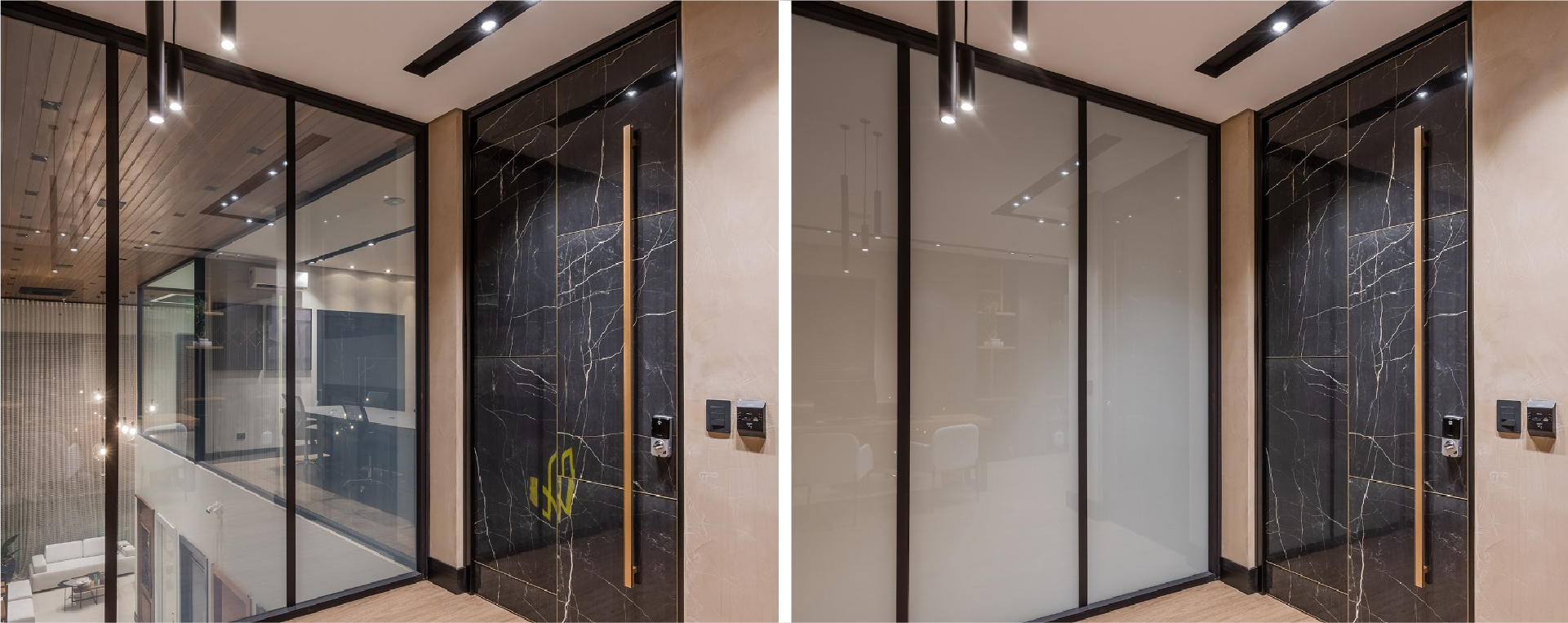 Versátil e aplicável em vários tipos de ambientes, o PKO Privacy Glass® é um vidro polarizado que permite controlar a privacidade e a entrada de luz em ambientes. Com um simples toque, você pode transformar o vidro de branco translúcido em incolor, ou vice-versa, através do acionamento do interruptor, controle remoto, smartphone ou até mesmo automação.
