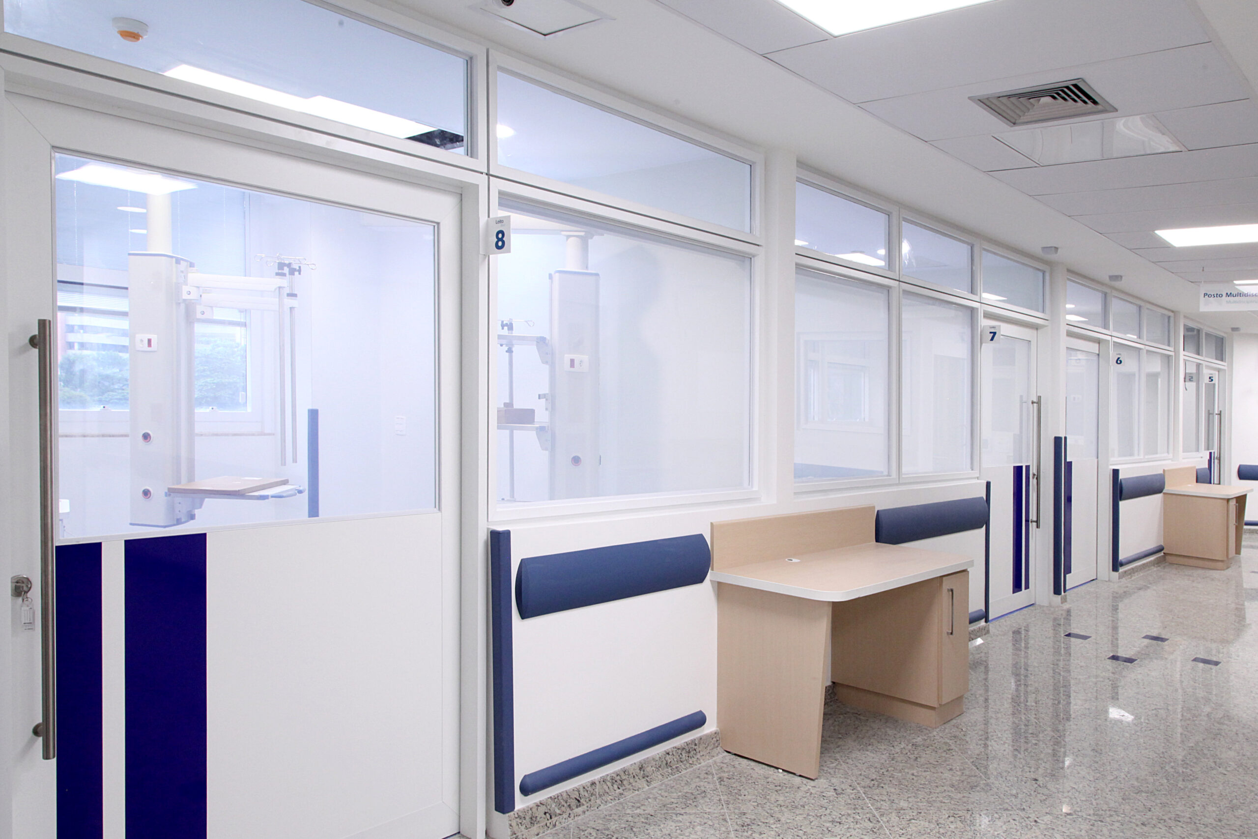 Para esse projeto foram especificados 65 m² de vidro polarizado Privacy Glass® aplicados na Unidade de Terapia Intensiva (UTI) do hospital. Essa solução representa o equilíbrio entre a privacidade e a entrada de luz nos ambientes. Isso porque utiliza uma tecnologia revolucionária que transforma o vidro translúcido branco em incolor, apenas ao apertar um botão.