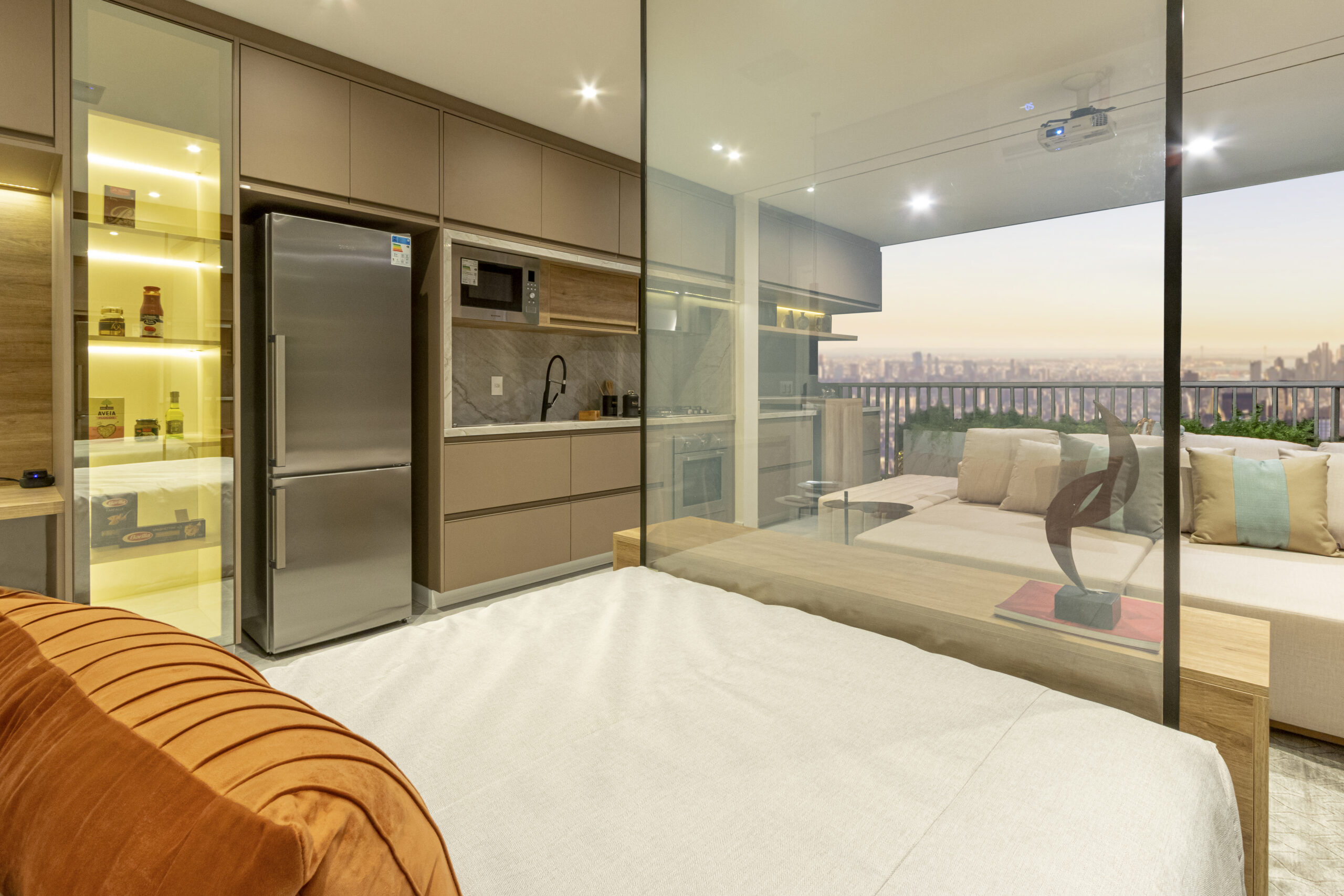 Para cada planta, um projeto de decoração único foi assinado por diferentes arquitetos. O apartamento studio de 45 m² ficou sob a responsabilidade de Fernanda Hoffmann, formada em arquitetura e urbanismo pela Unicamp, realiza, desde 2009, diversas obras residenciais e comerciais focando em ambientes agradáveis e atemporais.